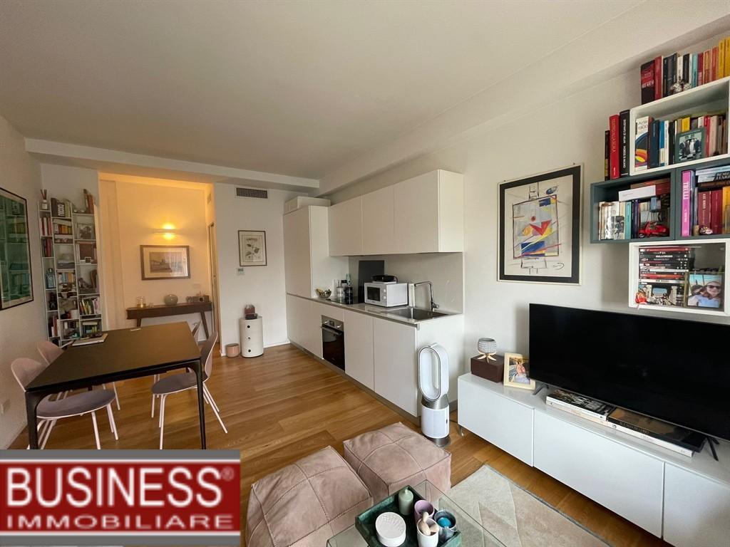 Composto da ingresso su ampia zona giorno con angolo cottura (dotato di microonde, lavastoviglie, lavasciuga, forno e piano a induzione, balcone, camera matrimoniale e bagno con doccia. Ottime finiture. Parquet e aria condizionata canalizzata.