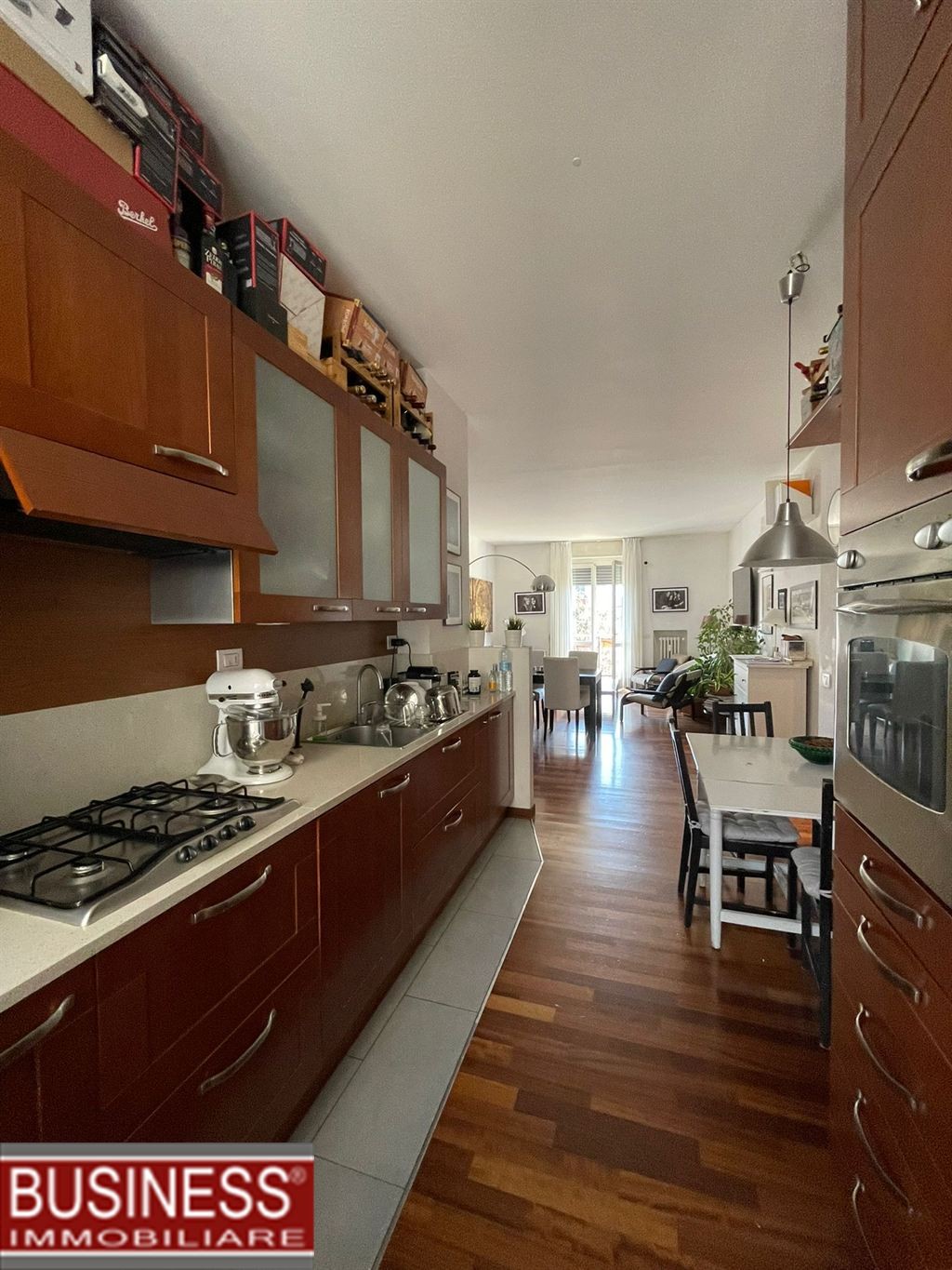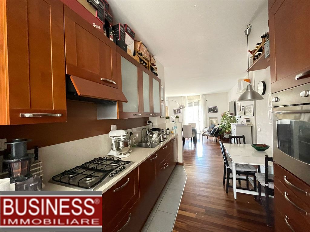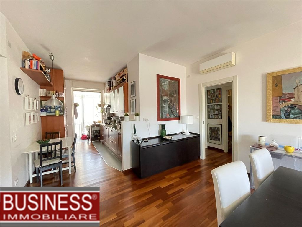 L’appartamento è così composto: Ampio ingresso, luminoso salone, cucina a vista, due camere da letto, due bagni, cabina armadio, zona lavanderia, due balconi e cantina.