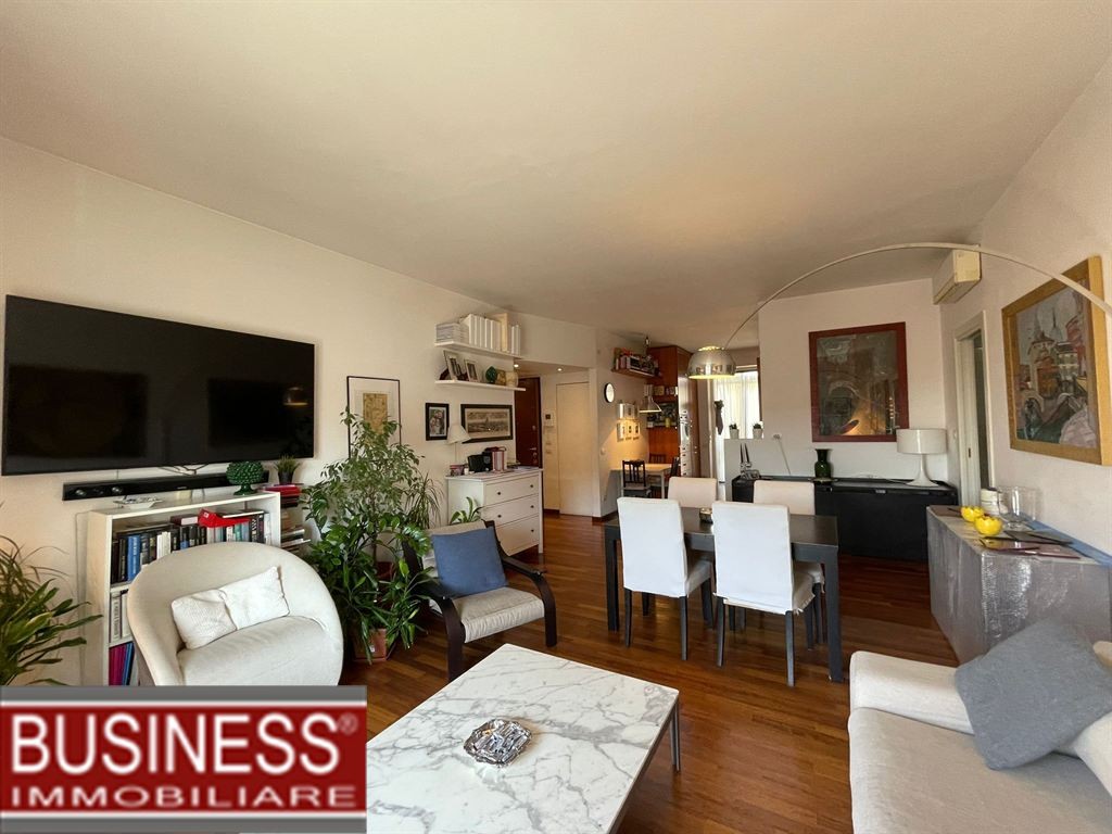 L’appartamento è così composto: Ampio ingresso, luminoso salone, cucina a vista, due camere da letto, due bagni, cabina armadio, zona lavanderia, due balconi e cantina.
